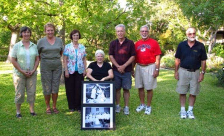 ![]() Right to right: Barbara McCall, Connie Hager [Wilmire], Peggy Osborn [Pifer], Bill and Polly, Roger Carrier, Doug Donnell and John McCall On Saturday, Polly and Bill had a BBQ dinner in their back yard. The following picture was taken in the same order, except a space was left open where Doug was.